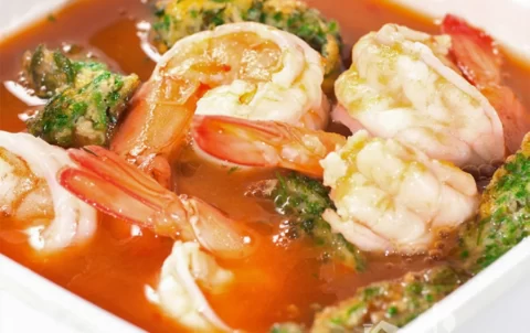 Spicy and sour tamarind soup with shrimp and fried omelette with herbs