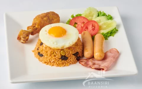 Fried rice in tomato sauce served with ham, sausage, fried chicken and fried egg
